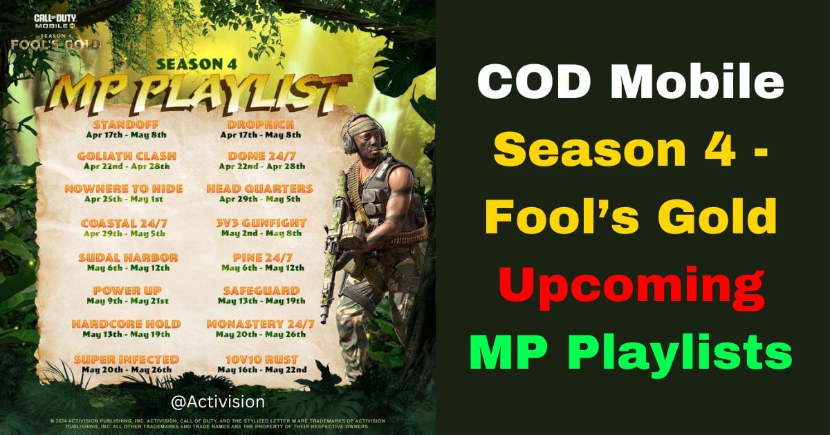 The COD Mobile Season 4 – Fool’s Gold is releasing on 17th April at 5 PM PT, offering a new rank series, battle pass, and MG42 LMG. The World Championship 2024 will also start after the update of Season 4 – Fool’s Gold in COD Mobile. Recently, Activision has shared an image on X (Twitter), which confirms all the upcoming multiplayer playlists in Season 4 with their time duration. The first playlist is “Standoff“, which will allow you to play on the remastered version of Standoff Map in COD Mobile.