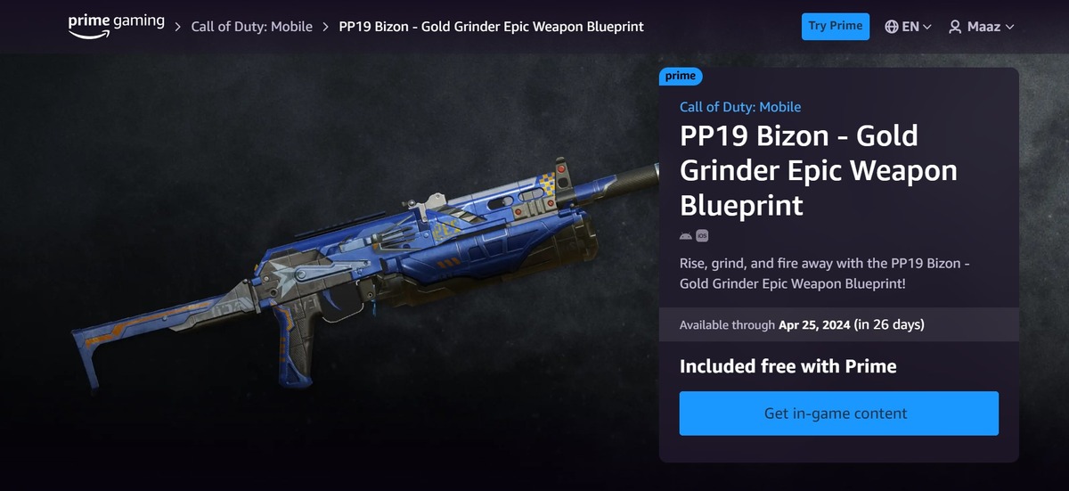 Amazon Prime Gaming with COD Mobile's PP19 Bizon - Gold Grinder Epic Weapon Blueprint page